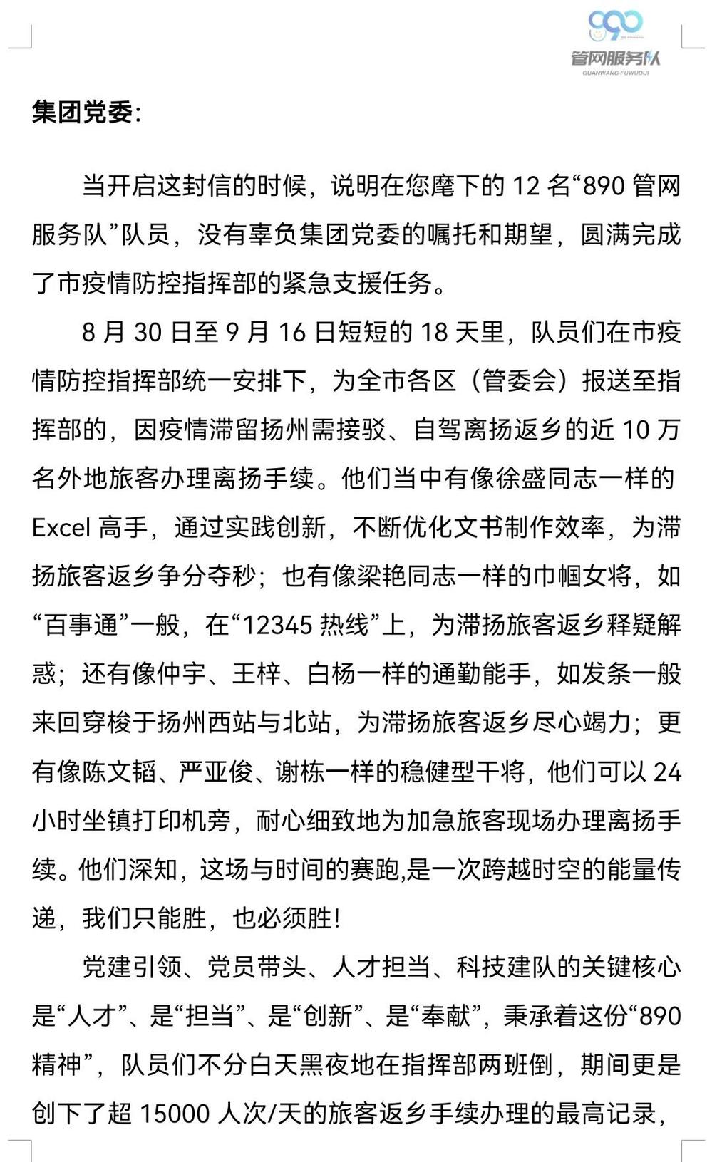 志愿服務(wù)工作結(jié)束后,這12名敬業(yè)而又可愛的志愿者將18天來(lái)工作的點(diǎn)點(diǎn)滴滴匯聚成了一封匯報(bào)信,向集團(tuán)黨委匯報(bào)他們不辱使命,用實(shí)際行動(dòng)踐行了“守城衛(wèi)家、城控有我”的鏗鏘誓言,并請(qǐng)集團(tuán)黨委放心,他們將把抗疫精神繼續(xù)延續(xù)到今后的工作中,讓890管網(wǎng)服務(wù)隊(duì)成為民生服務(wù)的金字招牌。