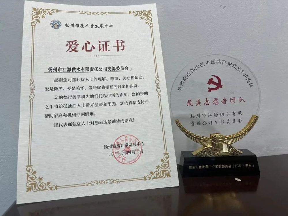 日前,長江水務江源公司“561”供水服務隊榮獲揚州市殘聯雛鷹兒童發展中心送來的愛心證書,感謝“561”供水服務隊的幫扶和服務,并授予其“最美志愿團隊”稱號。