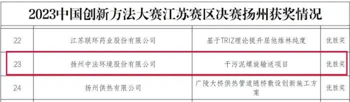 近日,揚州中法環(huán)境“兩段式干化工藝處理高含固率污泥”項目因創(chuàng)新程度高、實用性強等特點獲得了中國創(chuàng)新方法大賽優(yōu)勝獎和2023年度蘇伊士亞洲最佳創(chuàng)新獎。