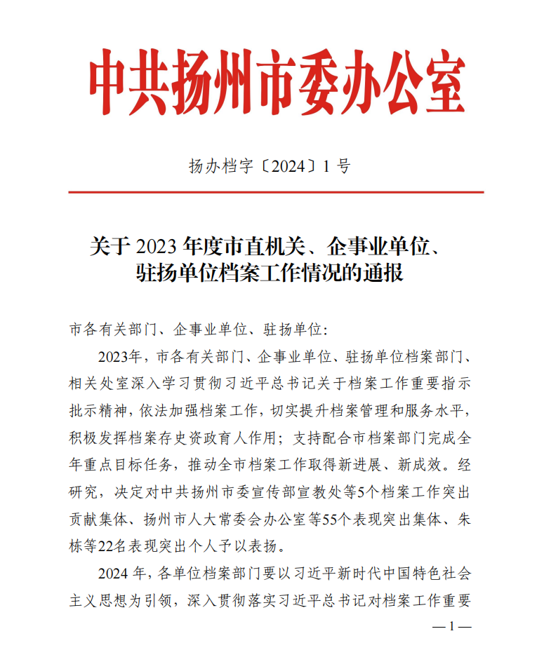 新年伊始,城控集團檔案工作迎來開門紅!揚州市委辦公室發文《關于2023年度市直機關、企事業單位、駐揚單位檔案工作情況的通報》,城控集團獲評“2023年度檔案工作表現突出集體”。